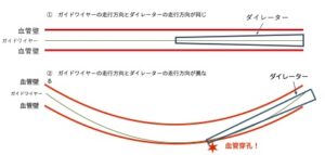 この力は、ダイレーターによって加えられたものと考えられます。つまり、ダイレーターの先端が血管=ガイドワイヤーの走行方向とは異なる方向に進行したため、ガイドワイヤー及び血管壁に強い力が加わったことを、ガイドワイヤーの屈曲は示しています。単純に示せば下図②のような状況です(これはあくまでも単純に図式化したものです。ガイドワイヤーもダイレーターも血管壁の外から挿入されるものなので、血管の走行とダイレーターの走行は①のように完全に一致することはありません)。