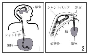 この続発性水頭症を予防するために、過剰になった脳脊髄液を、脳室内から腹腔へと排出するのが、VPシャントです。下図1がVPシャント全体像、下図2がシャントバルブと腹側チューブ、脳室側チューブの関係を示した図です。シャントバルブから左下方向に伸びているのが腹側チューブです。